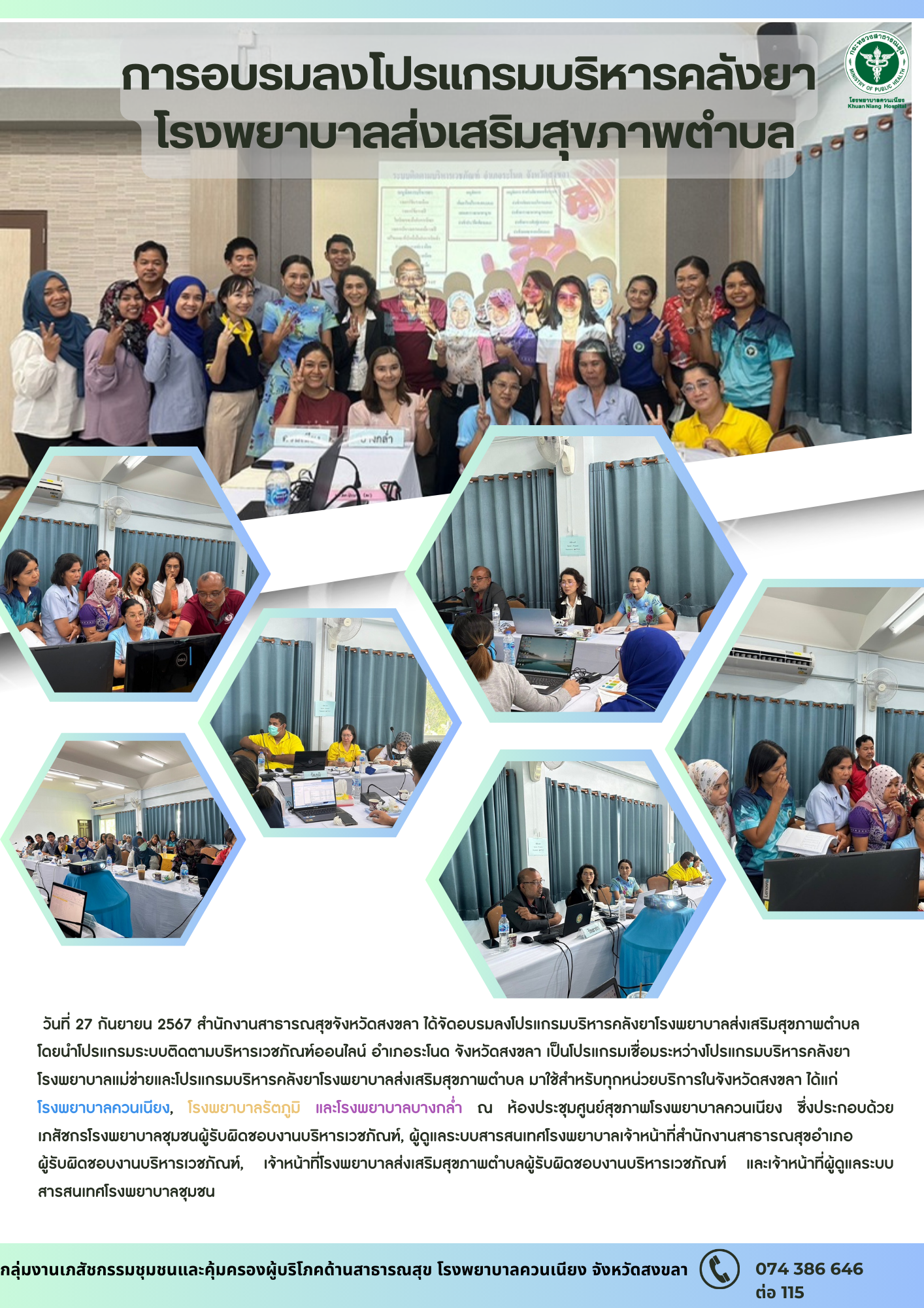 สื่อประชาสัมพันธ์/Onepage กิจกรรม 3 ตุลาคม 2024 admin การอบรมลงโปรแกรมบริหารคลังยา โรงพยาบาลส่งเสริมสุขภาพตำบล Read More