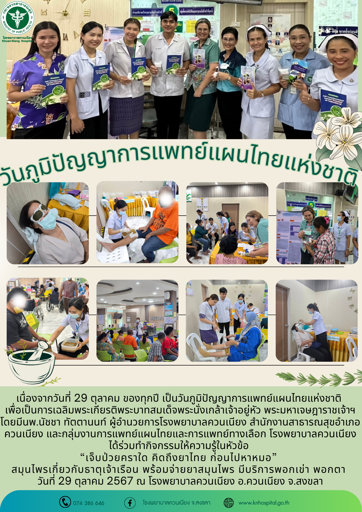 สื่อประชาสัมพันธ์/Onepage กิจกรรม วันภูมิปัญญาการแพทย์แผนไทยแห่งชาติ 29 ตุลาคม 2024 admin Post Views: 277